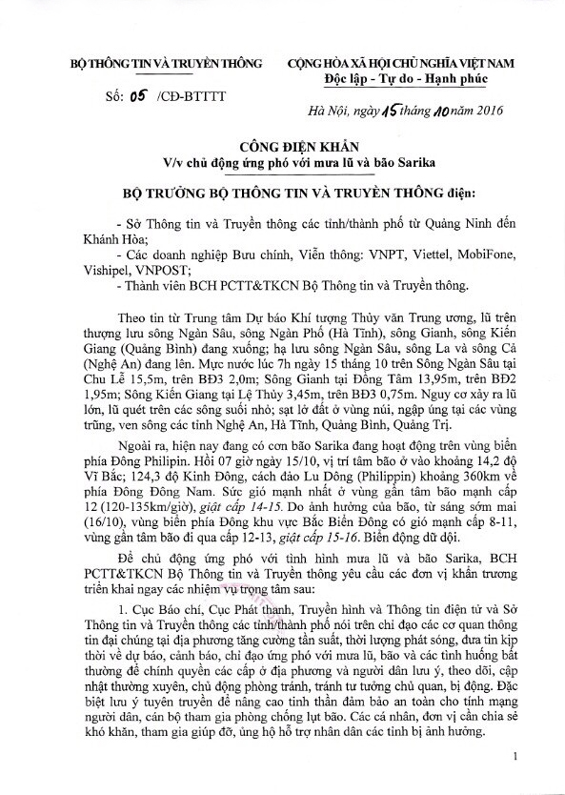 Ngày 15-10, Bộ Thông tin và Truyền thông đã có công điện khẩn gửi Sở Thông tin và Truyền thông các tỉnh, thành phố từ Quảng Ninh đến Khánh Hòa; các doanh nghiệp Bưu chính - Viễn thông: VNPT, Viettel, MobiFone, Vishipre, VNPOST; Thành viên BCH PCTT&TKCN Bộ Thông tin và Truyền thông về việc chủ động ứng phó với mưa lũ và bão Sarika. Nội dung công điện như sau: