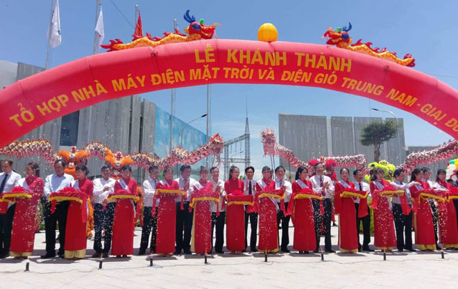 | Các đại biểu cắt băng khánh thành, đưa vào vận hành tổ hợp trang trại năng lượng tái tạo điện mặt trời và điện gió Trung Nam giai đoạn 1. |