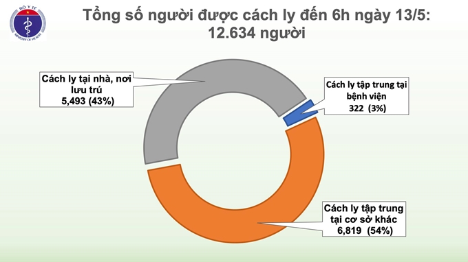 Hiện tổng số người tiếp xúc gần và nhập cảnh từ vùng dịch đang được theo dõi sức khỏe (cách ly) là 12.634, trong đó cách ly tập trung tại bệnh viện: 322; cách ly tập trung tại cơ sở khác: 6.819; cách ly tại nhà, nơi lưu trú: 5.493.