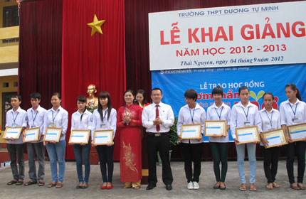 Nhân dịp khai giảng năm học mới 2012 - 2013, Ngân hàng Thương mại Cổ phần (TMCP) Sài gòn Thương tín (Sacombank) - Chi nhánh Thái Nguyên đã tổ chức trao 40 suất học bổng “Sacombank - ươm mầm cho những ước mơ”, mỗi suất 1 triệu đồng cho học sinh (HS) có hoàn cảnh khó khăn đạt kết quả cao trong học tập của 4 trường THPT là Dương Tự Minh, Chuyên Thái Nguyên, Ngô Quyền và Phổ Yên.