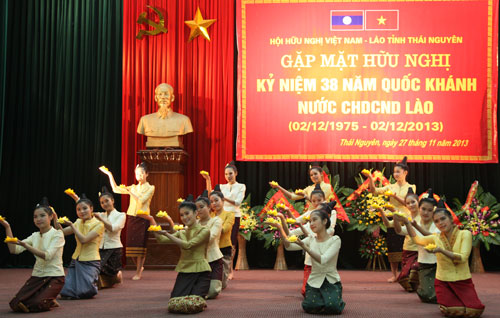 Ngày 27-11, Hội Hữu nghị Việt Nam - Lào tỉnh Thái Nguyên đã tổ chức buổi gặp mặt hữu nghị nhân kỷ niệm 38 năm Quốc khánh nước Cộng hòa Dân chủ Nhân dân Lào (2/12/1975 - 2/12/2013). Dự buổi gặp mặt có đồng chí Pheng Phăn Lương Many, Tham tán công sứ Đại sứ quán Lào tại Việt Nam; đại diện các lưu học sinh Lào đang học tập tại tỉnh ta. Về phía tỉnh có đồng chí Dương Ngọc Long, Phó Bí thư Tỉnh ủy, Chủ tịch UBND tỉnh; đại diện các sở, ban, ngành, huyện, thành, thị và các tổ chức chính trị - xã hội, doanh nghiệp trên địa bàn.