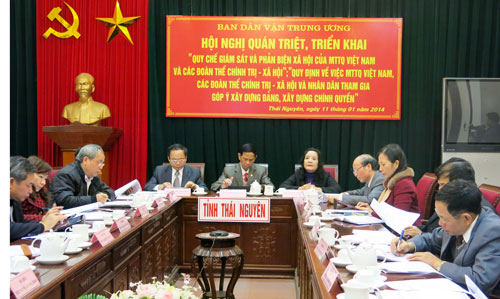 Ngày 11-1, Ban Dân vận Trung ương tổ chức Hội nghị trực tuyến quán triệt, triển khai Quyết định về việc ban hành Quy chế giám sát và phản biện xã hội của MTTQ Việt Nam và các đoàn thể chính trị - xã hội"; Quyết định về ban hành Quy định việc MTTQ Việt Nam, các đoàn thể chính trị, xã hội và nhân dân tham gia góp ý xây dựng Đảng, xây dựng chính quyền".
