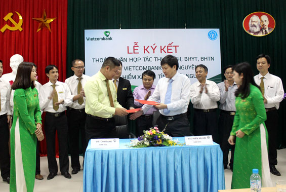 Thực hiện hợp đồng nguyên tắc số 240315/BHXH-NHNT giữa Bảo hiểm xã hội (BHXH) Việt Nam và Ngân hàng TMCP Ngoại thương Việt Nam (Vietcombank) về hợp tác thu, thu nợ BHXH, bảo hiểm y tế (BHYT), bảo hiểm thất nghiệp (BHTN), chiều 23-4, Vietcombank Thái Nguyên và BHXH tỉnh đã tổ chức Lễ ký kết hợp tác (ảnh).