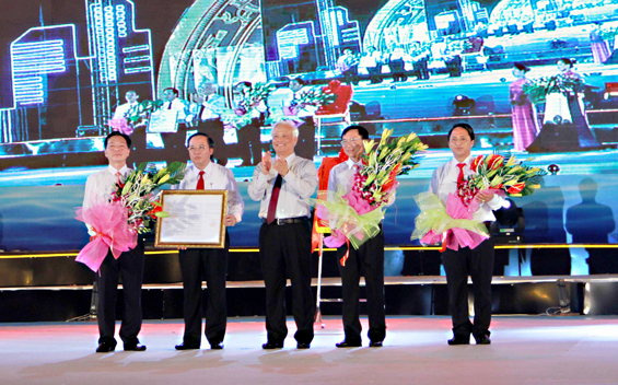 Đồng chí Trần Quốc Tỏ, Phó Bí thư Thường trực Tỉnh ủy trao bức Trướng của Tỉnh ủy, HĐND, UBND ghi nhận thành tích qua 30 năm xây dựng và phát triển T.P Sông Công.