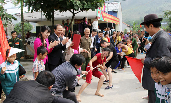 Các đồng chí lãnh đạo tỉnh, huyện tham gia cổ vũ trò chơi kéo co cùng nhân dân xóm Chăn Nuôi tại Ngày hội.