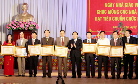 Ôn lại truyền thống Ngày Nhà giáo Việt Nam, GS-TS, NGND Đặng Kim Vui, Giám đốc ĐHTN nhấn mạnh: “Tôn sư trọng đạo” là truyền thống tốt đẹp của dân tộc ta từ ngàn xưa, nghề giáo luôn được tôn vinh là nghề cao quý nhất trong các nghề cao quý. Cùng với sự nghiệp phát triển giáo dục đào tạo của đất nước, ĐHTN không ngừng nâng cao chất lượng đội ngũ nhà giáo hiện nay, thúc đẩy ĐHTN ngày càng phát triển vững mạnh. Trải qua hơn 22 năm xây dựng và phát triển, ĐHTN luôn khẳng định vị thế của một trung tâm đào tạo, nghiên cứu khoa học và chuyển giao công nghệ lớn của đất nước. Hiện, ĐHTN có 27 cơ sở giáo dục đại học thành viên và đơn vị trực thuộc. Đội ngũ cán bộ của ĐHTN không ngừng tăng cả về số lượng và chất lượng. Hiện nay, ĐHTN có gần 4.400 cán bộ viên chức, trong đó có 10 GS, 123 PGS, 569 tiến sĩ, 6 nhà giáo nhân dân, 70 nhà giáo ưu tú và 9 thầy thuốc ưu tú. Riêng năm 2016, ĐHTN có thêm 3 nhà giáo được công nhận chức danh GS, 20 nhà giáo được công nhận chức danh PGS, 56 nhà giáo bảo vệ thành công luận án tiến sĩ.