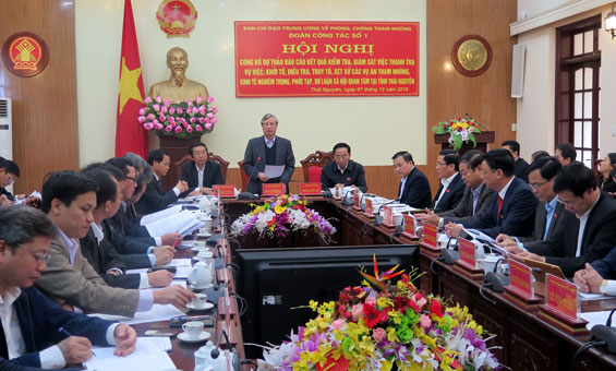 Ngày 7-12, tại trụ sở UBND tỉnh, Đoàn công tác số 1 của Ban Chỉ đạo Trung ương về phòng chống tham nhũng đã tổ chức Hội nghị công bố Dự thảo Báo cáo kết quả kiểm tra, giám sát việc thanh tra vụ việc; khởi tố, điều tra, truy tố, xét xử các vụ án tham nhũng, kinh tế nghiêm trọng, phức tạp, dư luận xã hội quan tâm trên địa bàn tỉnh.