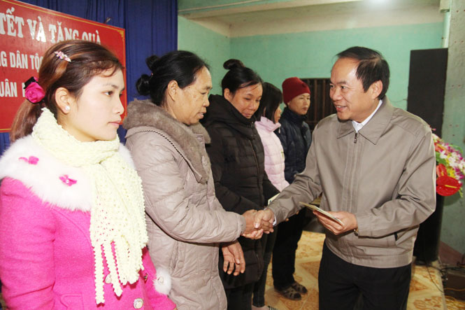 Tại các nơi đến, Đoàn đã ân cần hỏi thăm sức khỏe, tình hình đời sống, chuẩn bị Tết Nguyên đán của bà con. Đồng thời trao tặng 45 suất quà (mỗi suất trị giá 400.000 đồng) cho 45 hộ đồng bào dân tộc thiểu số nghèo, có hoàn cảnh khó khăn trên địa bàn hai xã. Thay mặt Đoàn công tác, đồng chí Nguyễn Thái Nam, Trưởng ban Dân tộc tỉnh đã động viên, mong muốn các hộ gia đình sớm vượt qua khó khăn, vươn lên trong cuộc sống và đón Tết Nguyên đán Mậu Tuất 2018 vui tươi, hạnh phúc.
