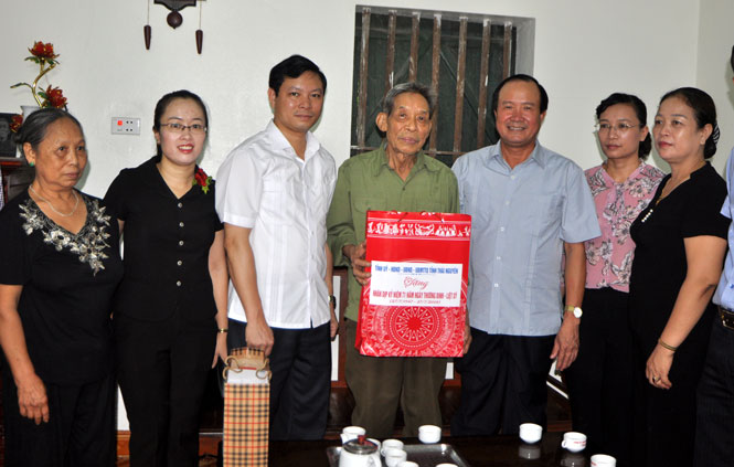* Tại T.P Thái Nguyên, Đoàn do đồng chí Lê Văn Tuấn, Ủy viên Ban Thường vụ Tỉnh ủy, Trưởng Ban Tuyên giáo Tỉnh ủy làm Trưởng đoàn; đồng chí Đoàn Thị Hảo, Ủy viên Ban Thường vụ Tỉnh ủy, Bí thư Thành ủy Thái Nguyên đã đến thăm và tặng quà 3 gia đình tại phường Đồng Quang: ông Nguyễn Văn Bình, sinh năm 1952; thương binh La Văn Minh, sinh năm 1942 và thương binh Nguyễn Mạnh Tiêu.