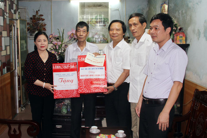 * Tại T.P Sông Công, Đoàn do đồng chí Nguyễn Văn Khoa, Ủy viên Ban Thường vụ, Chủ nhiệm Ủy ban Kiểm tra Tỉnh ủy làm Trưởng đoàn đã đến thăm, tặng quà 3 gia đình: bà Phạm Thị Ngồng (sinh năm 1939), ở tổ 13, phường Thắng Lợi, vợ liệt sĩ Phạm Thanh Vọng; ông Trần Đình Vấn (sinh năm 1940), ở tổ dân phố An Châu 1, phường Mỏ Chè, là nạn nhân chất độc hóa học, bệnh binh suy giảm khả năng lao động 70%; bà Dương Thị Tích (sinh năm 1929), ở tổ dân phố Làng Mới, phường Bách Quang, mẹ liệt sĩ Dương Văn Hoa.