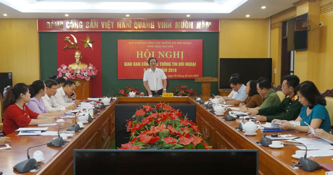 Chiều ngày 10-10, Ban Chỉ đạo Công tác thông tin đối ngoại tỉnh đã tổ chức Hội nghị giao ban công tác thông tin đối ngoại 9 tháng năm 2018, triển khai nhiệm vụ 3 tháng cuối năm. Đồng chí Lê Văn Tuấn, Ủy viên Ban Thường vụ, Trưởng Ban Tuyên giáo Tỉnh ủy, Trưởng Ban Chỉ đạo chủ trì Hội nghị.