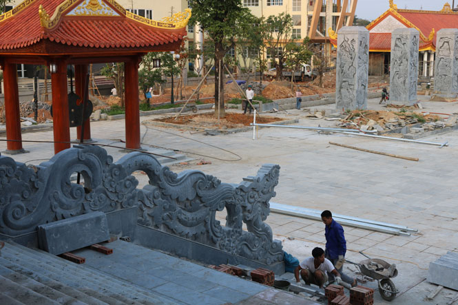 Ngay trước Nhà tưởng niệm, bên từng bậc lên xuống, chúng tôi chứng kiến những người thợ mồ hôi bết lưng áo, nhưng có đôi bàn tay khéo léo của một nghệ nhân đang cẩn thận, tỷ mỉ đặt từng viên đá xuống mặt nền. Ông Trần Văn Giảng cho biết: Tôi là người lao động của Công ty cổ phần Đầu tư xây dựng và Khai thác khoáng sản Thăng Long. Tôi tham gia thi công tại công trình này từ 6 tháng nay. Với tôi, đó là một vinh dự.