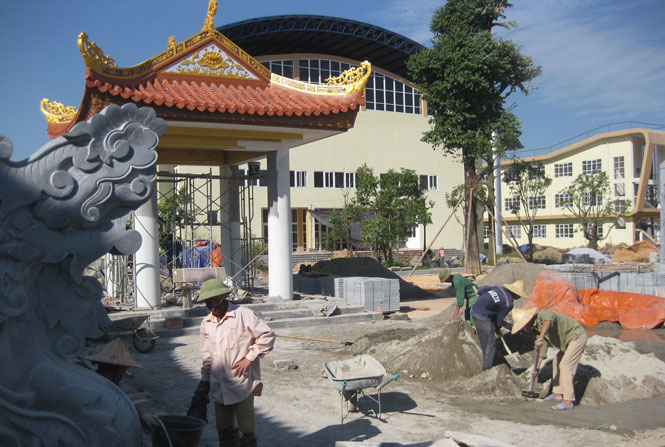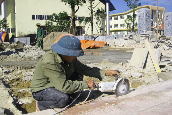 Người lao động dồn sức hoàn thiện việc lát đá sân Nhà tưởng niệm.