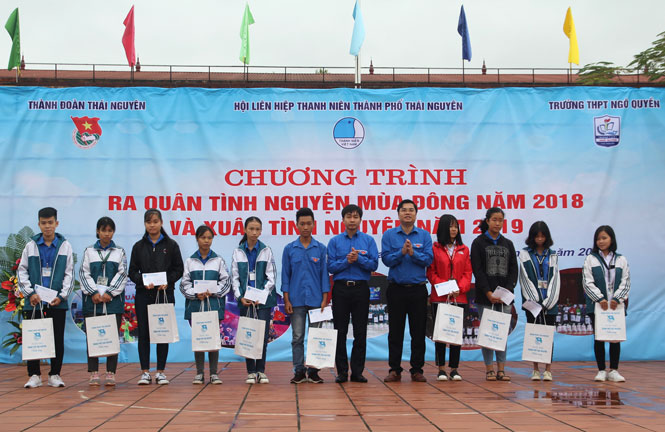 Tại Lễ ra quân, Thành đoàn, Hội Liên hiệp Thanh niên T.P Thái Nguyên đã trao 10 suất học bổng và quà (mỗi suất trị giá 350 nghìn đồng) cho 10 học sinh có hoàn cảnh khó khăn của Trường THPT Ngô Quyền (ảnh); Công ty TNHH MTV Chuyển phát nhanh Thuận Phong – Chi nhánh Thái Nguyên tặng 10 suất quà (mỗi suất 300 nghìn đồng) cho 10 em học sinh nghèo vượt khó Trường Tiểu học Lương Ngọc Quyến; tổ chức quyên góp, ủng hộ Chương trình được trên 30 triệu đồng.