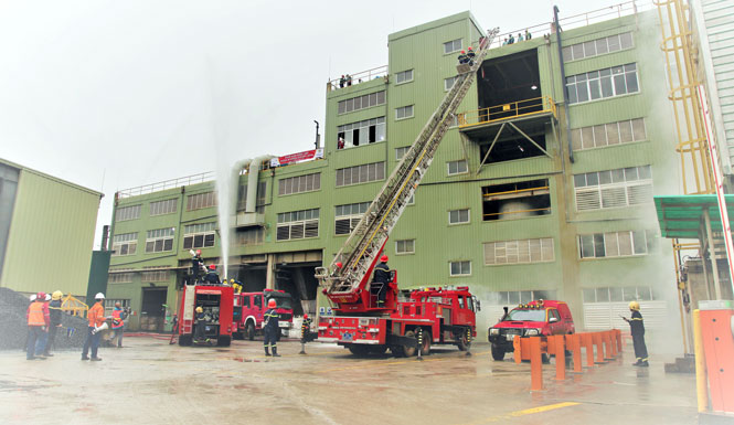 Tình huống giả định: Do đường ống dẫn khí Hydro Sunphua bị rò rỉ gây ra cháy tại khu vực sản xuất, phát hiện sự cố Công ty đã tổ chức sơ tán công nhân, tài sản, triển khai phương tiện chữa cháy tại chỗ, đồng thời điện báo cho lực lượng chữa cháy chuyên nghiệp. Nhận được tin báo, Phòng Cảnh sát phòng cháy, chữa cháy và cứu nạn, cứu hộ điều động 5 xe chữa cháy với hơn 30 cán bộ, chiến sĩ nhanh chóng đến hiện trường, triển khai đội hình chữa cháy và tổ chức cứu người bị nạn... Chỉ trong một thời gian ngắn số người bị thương đã được đưa đi cấp cứu, hàng hoá được vận chuyển đến nơi an toàn, đám cháy được khống chế và dập tắt.