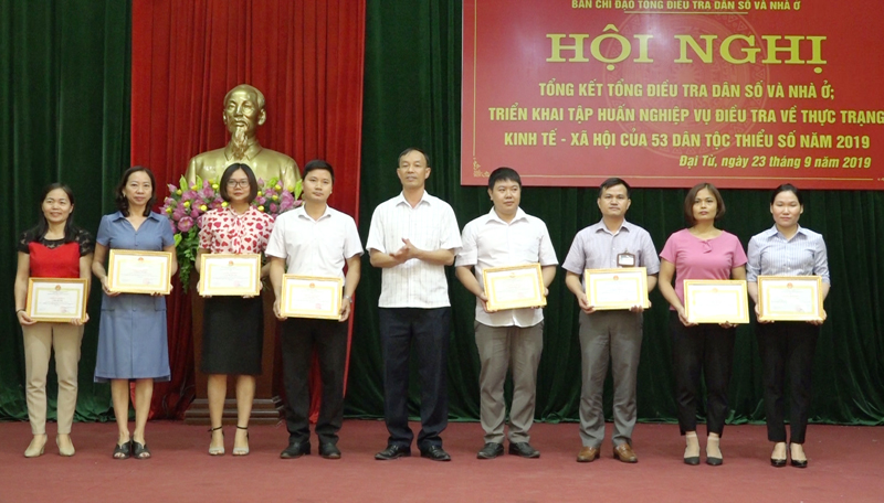 Tại Hội nghị, UBND tỉnh đã trao tặng Bằng khen cho 2 tập thể, 3 cá nhân; Cục Thống kê tỉnh tặng Giấy khen cho 3 tập thể, 4 cá nhân; UBND huyện khen thưởng 7 tập thể, 8 cá nhân có thành tích xuất sắc trong công tác điều tra dân số và nhà ở năm 2019 (ảnh).