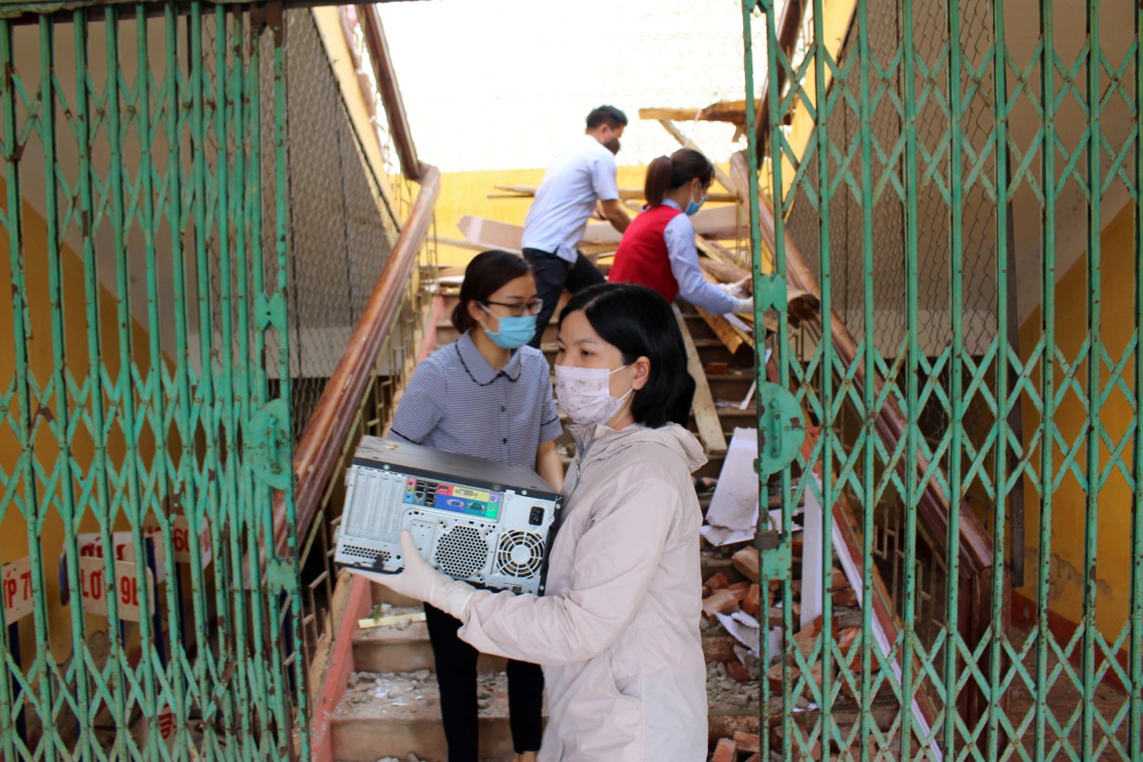 Cán bộ, giáo viên trường THCS Tân Cương dọn dẹp, khắc phục hậu quả trận mưa dông