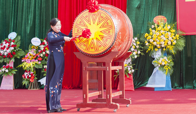 Đồng chí Hoàng Văn Hùng, Ủy viên Ban Thường vụ Tỉnh ủy, Phó Trưởng Đoàn chuyên trách Đoàn đại biểu Quốc hội tỉnh đánh trống khai trường năm học mới.