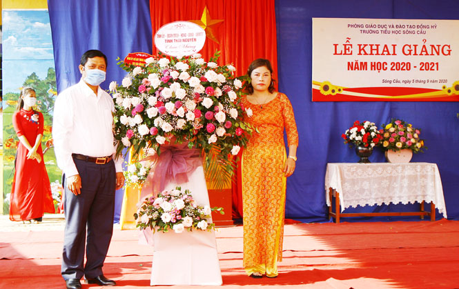 Đồng chí Đặng Xuân Trường, Ủy viên Ban Thường vụ, Trưởng Ban Nội chính Tỉnh ủy tặng hoa chúc mừng thầy và trò Trường THCS Nguyễn Du (T.P Sông Công) nhân dịp khai giảng năm học mới.