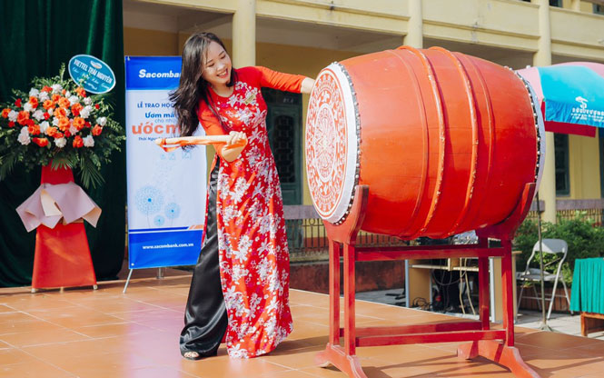 Nhà giáo ưu tú Ngô Thị Quyên, Bí Thư Đảng bộ, Hiệu trưởng Nhà trường đánh trống khai trường năm học mới.
