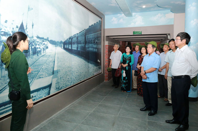 Các thành viên trong Đoàn Hội cán bộ Thái Nguyên tại Hà Nội thăm không gian trưng bày tài liệu, hiện vật TNXP Đại đội 915, Đội 91 Bắc Thái.