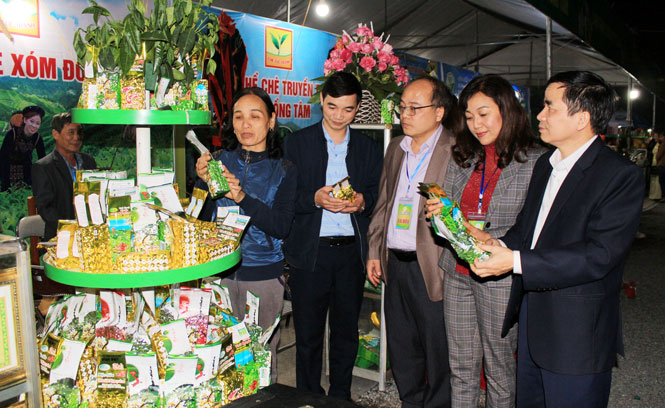 Các đại biểu thăm quan gian hàng trưng bày sản phẩm chè của các làng nghề chè trên địa bàn xã Tức Tranh.