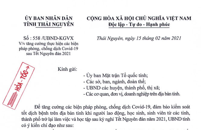 Ngày 15-2, UBND tỉnh đã ban hành văn bản số 558 Tăng cường các biện pháp phòng, chống dịch COVID -19 sau Tết Nguyên đán. Để bảo đảm kiểm soát tốt dịch bệnh khi người lao động, học sinh, sinh viên từ các tỉnh, thành phố trở lại làm việc, học tập sau kỳ nghỉ Tết Nguyên đán 2021, UBND tỉnh có ý kiến chỉ đạo cụ thể, dưới đây là toàn bộ nội dung văn bản.