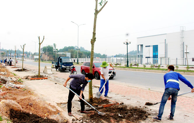 Công nhân Công ty TNHH Dongwha Việt Nam (Khu công nghiệp Điềm Thụy) trồng cây xanh xung quanh nhà máy mới xây dựng, góp phần bảo vệ môi trường trong sản xuất công nghiệp. Ảnh: Tư liệu.