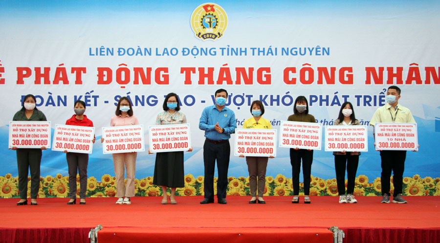 Nhân dịp này, LĐLĐ tỉnh đã trao kinh phí hỗ trợ xây dựng NTM cho 5 huyện, thị xã, thành phố với tổng số tiền 500 triệu đồng; hỗ trợ xây dựng 25 nhà mái ấm công đoàn cho công nhân, nhân viên, lao động có hoàn cảnh khó khăn với tổng trị giá trên 750 triệu đồng; phối hợp với các đơn vị tư vấn, khám bệnh và thay dầu xe miễn phí cho công nhân có hoàn cảnh khó khăn...