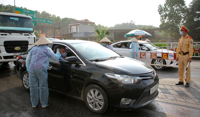 Người dân được đo thân nhiệt và khai báo y tế khi đi qua chốt kiểm soát đặt tại nút giao Yên Bình (T.X Phổ Yên).
