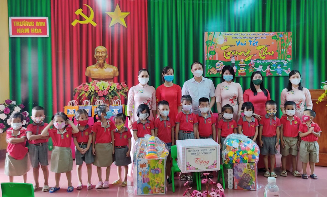 Nhân dịp này, các đồng chí lãnh đạo Huyện ủy - HĐND - UBND huyện đã kiểm tra, tham quan khu vui chơi, học tập, khu bếp ăn của các em học sinh; kiểm tra việc thực hiện công tác phòng, chống dịch COVID-19 tại các nhà trường; đồng thời trao tặng quà (gồm bánh kẹo, đồ chơi) cho cô và trò các nhà trường với tổng giá trị 30 triệu đồng...