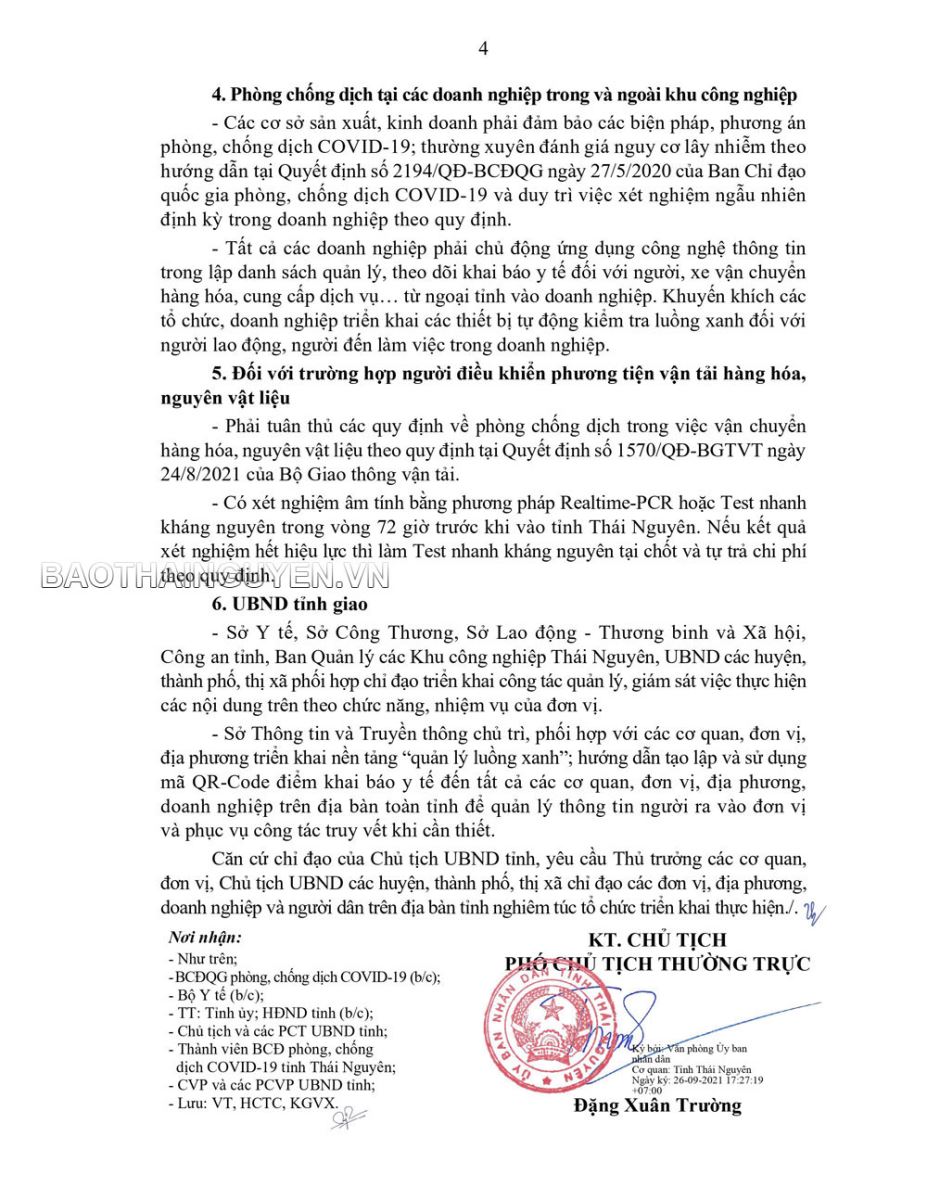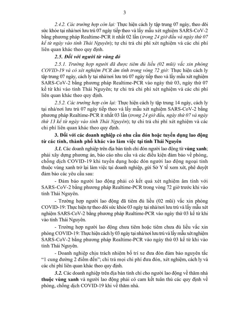 Đối với người ra/vào tỉnh Thái Nguyên, UBND tỉnh yêu cầu thực hiện nghiêm thông điệp 5K của Bộ Y tế; khai báo y tế tại các Chốt kiểm soát dịch COVID-19 trước khi ra/vào tỉnh và hoàn toàn chịu trách nhiệm trước pháp luật nếu khai báo y tế không trung thực. Đối với người có sử dụng điện thoại thông minh, khi ra/vào tỉnh Thái Nguyên phải cài đặt, sử dụng và thường xuyên bật ứng dụng khai báo y tế…