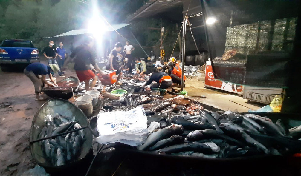 Bà con thu vớt, xử lý cá chết đến tận đêm khuya.