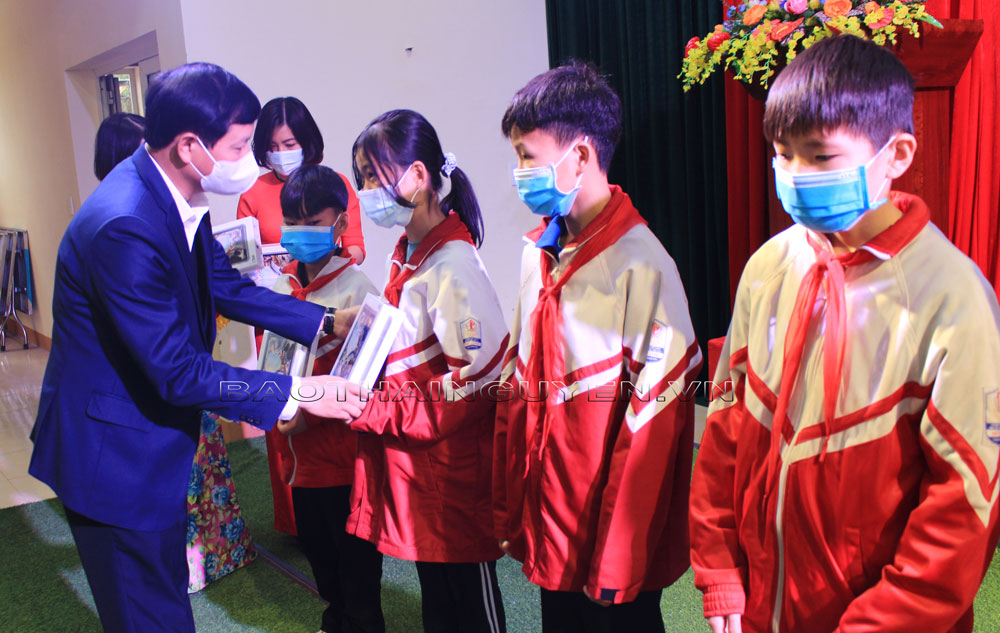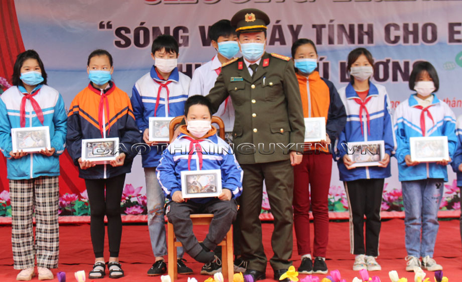 * Tại huyện Phú Lương, Đại tá Nguyễn Văn Vui, Phó Giám đốc Công an tỉnh trao tặng 52 máy tính bảng cho học sinh có hoàn cảnh khó khăn, chưa có thiết bị học trực tuyến của Trường Tiểu học Phấn Mễ 2 và Trường THCS Phấn Mễ.
