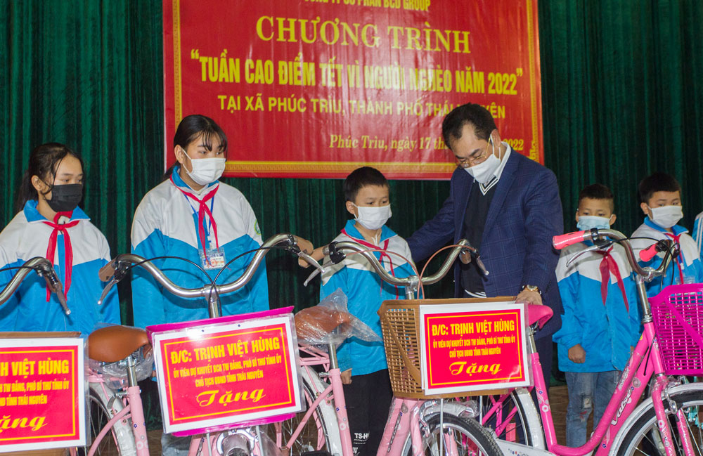 Tại Chương trình, thay mặt Đoàn công tác, đồng chí Trịnh Việt Hùng đã trao tặng 50 chiếc xe đạp (trong đó, trao trực tiếp 10 chiếc, còn lại giao cho địa phương chuyển giúp) cho 50 học sinh nghèo vượt khó của Trường THCS Phúc Trìu; tặng 31 sổ tiết kiệm cho 31 hộ nghèo và 80 triệu đồng cho 2 hộ nghèo để sửa chữa nhà ở. Tổng giá trị quà tặng đợt này là khoảng 800 triệu đồng.