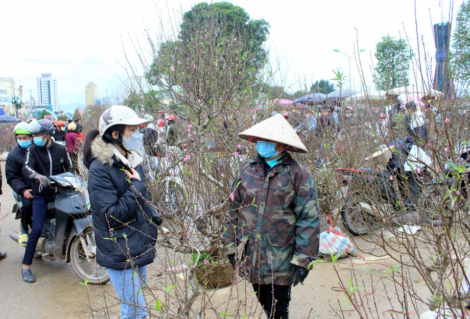 Nhộn nhịp, đông đúc nhất trong chiều 29 Tết là tại các chợ hoa, cây cảnh khi nhiều người dân vẫn tranh thủ đi mua sắm những cành đào, hoa tươi về để trang trí nhà cửa đón giao thừa. Theo ghi nhận của chúng tôi, tại khu vực đường Hùng Vương và Quảng trường Võ Nguyên Giáp, đến khoảng 18 giờ chiều, lượng đào, quất, cây cảnh và các loại hoa tươi đã được các tiểu thương bán gần hết.