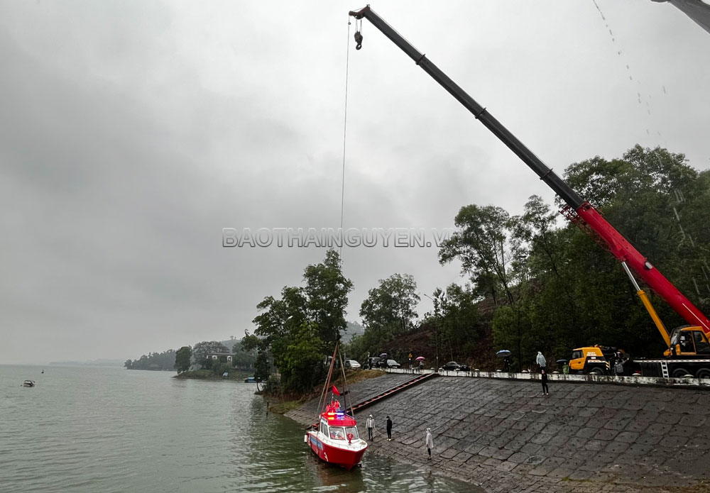 Hạ thủy tàu đa năng xuống hồ Núi Cốc.