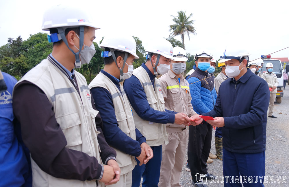 Nhân dịp đầu Xuân mới, các đồng chí lãnh đạo tỉnh tặng quà, động viên người lao động trên các công trình.