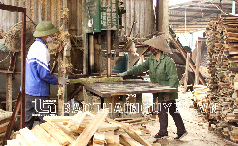 Năm 2022, huyện Đại Từ phấn đấu giá trị sản xuất công nghiệp - tiểu thủ công nghiệp phần do địa phương quản lý tăng 7% trở lên. Trong ảnh: Sản xuất gỗ bóc tại xã Mỹ Yên.