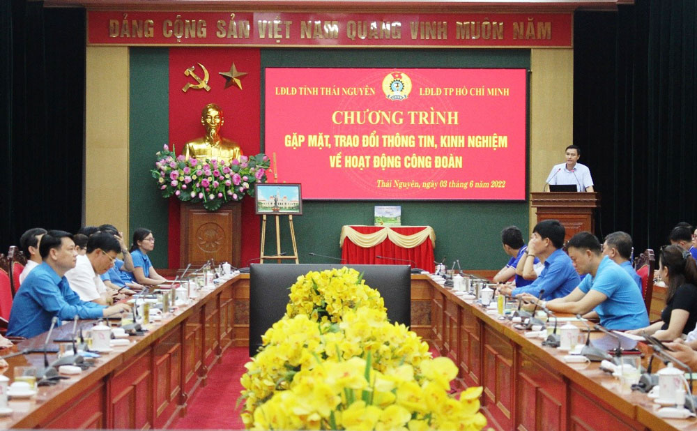 Tiếp đó, lãnh đạo LĐLD TP. Hồ Chí Minh và tỉnh Thái Nguyên đã chia sẻ thông tin, trao đổi kinh nghiệm, những cách làm hay, sáng tạo trong phát triển tổ chức công đoàn, nhất là trong doanh nghiệp FDI; phương thức tổ chức hoạt động chăm lo, bảo vệ quyền lợi chính đáng cho cán bộ, công nhân viên chức, lao động...