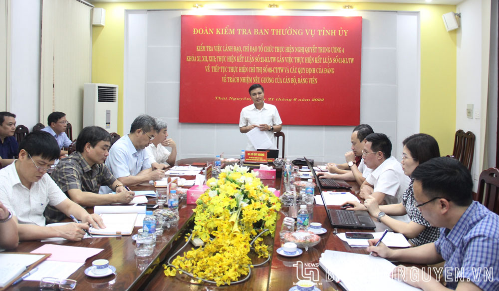 Tiếp tục chương trình kiểm tra của Ban Thường vụ Tỉnh ủy, chiều 21-6, Đoàn kiểm tra số 2 do đồng chí Vũ Duy Hoàng, Ủy viên Ban Thường vụ, Trưởng Ban Tuyên giáo Tỉnh ủy làm Trưởng đoàn có buổi làm việc tại Đảng bộ Công ty CP Gang thép Thái Nguyên về việc lãnh đạo, chỉ đạo tổ chức thực hiện Nghị quyết Trung ương 4 khóa XI, XII, XIII; Kết luận số 21-KL/TW gắn thực hiện Kết luận số 01-KL/TW về tiếp tục thực hiện Chỉ thị số 05-CT/TW của Bộ Chính trị “Về đẩy mạnh học tập và làm theo tư tưởng, đạo đức, phong cách Hồ Chí Minh” và các quy định của Đảng về trách nhiệm nêu gương của cán bộ, đảng viên, nhất là người đứng đầu cấp ủy, chính quyền, cơ quan, đơn vị (ảnh).