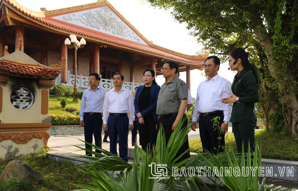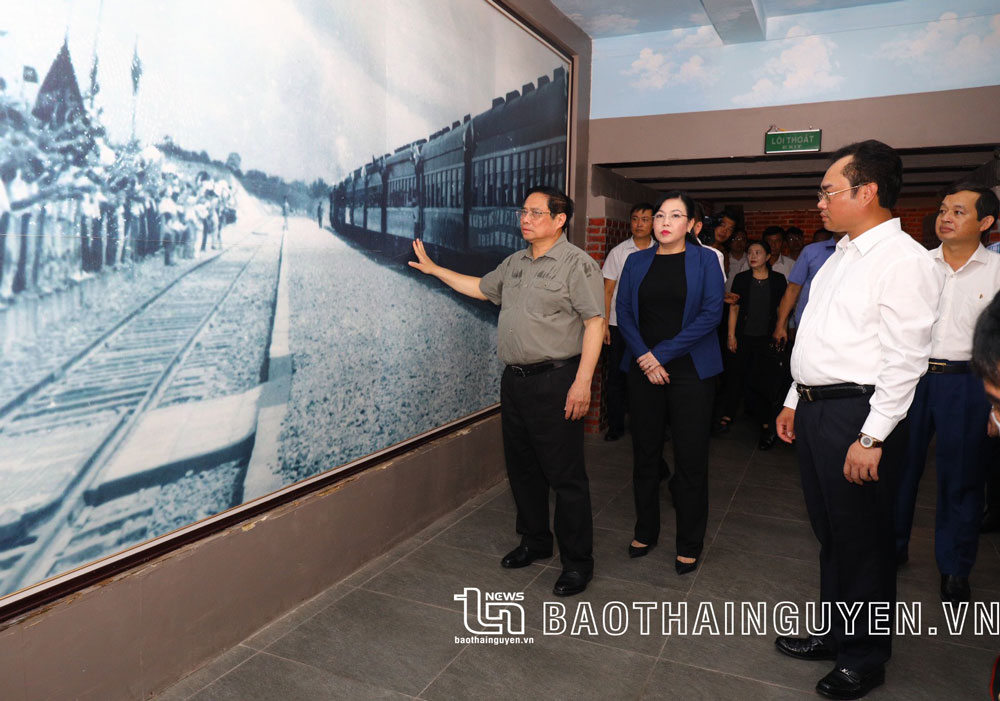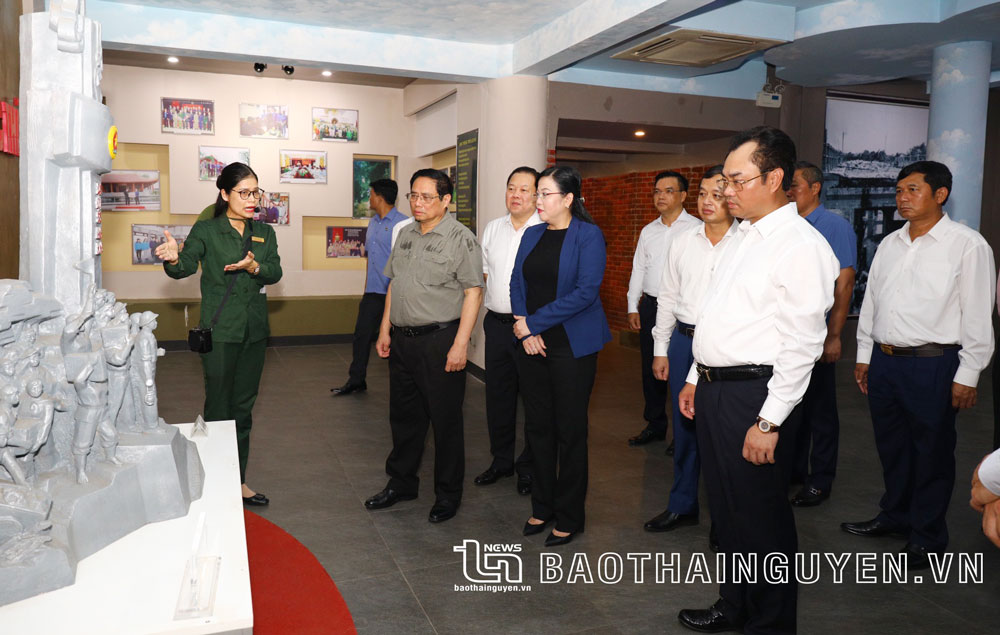 Sau Lễ dâng hương, Thủ tướng Phạm Minh Chính và các thành viên trong Đoàn tham quan Không gian trưng bày tài liệu, hiện vật TNXP Đại đội 915, Đội 91 Bắc Thái.