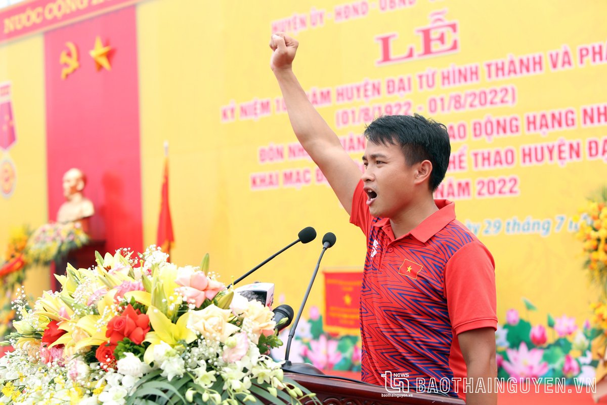- Từ 9 giờ 46 phút: Đại diện các vận động viên tham gia thi đấu tại Đại hội Thể dục thể thao huyện Đại Từ lần thứ VII năm 2022 lên tuyên hứa; đại diện lực lượng trọng tài tại Đại hội lên tuyên thệ.