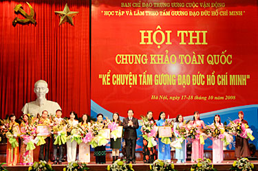 Sau 2 ngày thi sôi nổi và hấp dẫn, tối qua 18-10, tại Hội trường Học viện Chính trị - Hành chính quốc gia Hồ Chí Minh, Ban Tuyên giáo TƯ đã tổ chức trọng thể Lễ tổng kết và trao giải Hội thi Chung khảo toàn quốc “Kể chuyện tấm gương đạo đức Hồ Chí Minh”.
