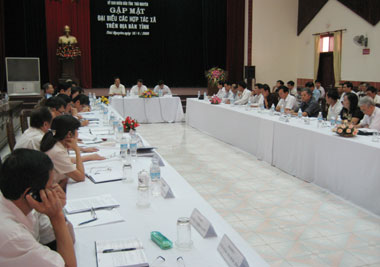 Ngày 16/4, Ban Chỉ đạo (BCĐ) đổi mới, phát triển kinh tế hợp tác xã (HTX) tỉnh đã tổ chức hội nghị gặp mặt giữa lãnh đạo tỉnh với chủ nhiệm các hợp tác xã (HTX) để đánh giá tình hình thực hiện Đề án "Tiếp tục đổi mới, phát triển và nâng cao hiệu quả kinh tế tập thể tỉnh Thái Nguyên giai đoạn 2006 - 2010" (viết tắt là đề án đổi mới phát triển HTX) và tháo gỡ những khó khăn vướng mắc cho HTX (ảnh).