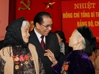 Nhân dịp này, Tổng Bí thư Nông Đức Mạnh tới thăm và chúc Tết cán bộ, đảng viên và nhân dân phường Quán Thánh, quận Ba Đình./.