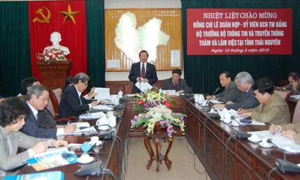 Thay mặt lãnh đạo tỉnh, đồng chí Phạm Xuân Đương đã báo cáo nhanh với Bộ trưởng về tình hình phát triển kinh tế - xã hội của tỉnh năm 2009 và những định hướng lớn trong năm 2010. Riêng trong lĩnh vực thông tin và truyền thông, cho đến nay, Thái Nguyên đã có sự phát triển mạnh mẽ. Báo cáo của Sở TT-TT tại buổi làm việc đã nêu rõ: Đến nay, bằng sự nỗ lực chung, tỉnh đã tập trung chỉ đạo giải quyết những mặt công tác trọng điểm mang tính đột phá của ngành như ứng dụng CNTT trong các cơ quan Nhà nước; đẩy mạnh công tác quản lý Nhà nước trên 5 lĩnh vực lớn là báo chí, xuất bản, bưu chính, viễn thông, CNTT, tạo điều kiện để thông tin và truyền thông tiếp tục phát triển, tạo thế và lực mới cho năm 2010, đưa sự nghiệp thông tin và truyền thông phát triển bền vững. Trên những mặt cụ thể, tỉnh đã đẩy mạnh công tác quy hoạch và xây dựng kế hoạch theo lộ trình phát triển trong lĩnh vực này; công tác xây dựng văn bản pháp quy đã được chú trọng với các văn bản được ban hành và triển khai thực hiện như các quy định về sử dụng Internet, thư điện tử, cấp phép xây dựng các trạm BTS, quy định về phát ngôn và cung cấp thông tin cho báo chí và quy định về chế độ nhuận bút trên địa bàn.