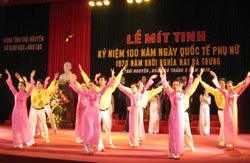 Tại Lễ kỷ niệm, các đại biểu đã ôn lại truyền thống vẻ vang 100 năm qua của phụ nữ thế giới, trong đó nhấn mạnh đến vai trò, đóng góp của phụ nữ Việt Nam, đồng thời nêu rõ vị trí, vai trò và công sức đóng góp của phụ nữ huyện Phú Bình đối với địa phương những năm qua trên các mặt kinh tế, chính trị, xã hội, đặc biệt là trong việc giữ gìn hạnh phúc gia đình.