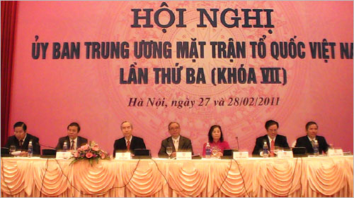 Ngày 27/2, tại Hà Nội diễn ra Hội nghị lần thứ 3 Ủy ban Trung ương Mặt trận Tổ quốc Việt Nam (MTTQVN) khóa VII nhằm đánh giá kết quả công tác Mặt trận năm 2010, xác định chương trình phối hợp, thống nhất hành động năm 2011.