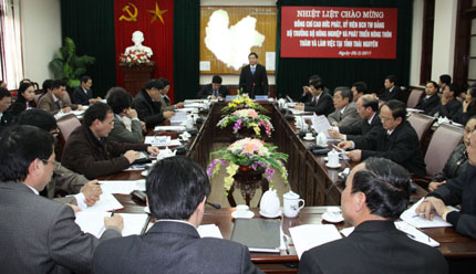 Tiếp và làm việc với Đoàn công tác có các đồng chí: Phạm Xuân Đương, Uỷ viên BCH Trung ương Đảng, Bí thư Tỉnh uỷ, Chủ tịch UBND tỉnh; Nguyễn Văn Kim, Phó Bí thư Thường trực Tỉnh uỷ, Trưởng ban Chỉ đạo về thực hiện Nghị quyết Trung ương 7 của tỉnh; các đồng chí trong Ban Thường vụ Tỉnh uỷ; lãnh đạo các sở, ban, ngành, các huyện, thành, thị trong tỉnh.